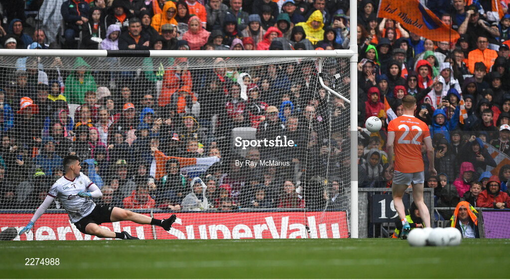 26 June 2022; Galway goalkeeper Conor Gleeson looks to his left as Conor Turbitt of Armagh fails to score a penalty during the GAA Football All-Ireland Senior Championship Quarter-Final match between Armagh and Galway at Croke Park, Dublin. Photo by Ray McManus/Sportsfile