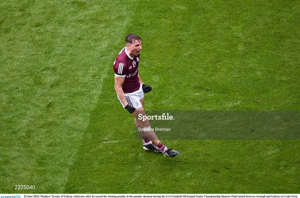 26 June 2022; Matthew Tierney of Galway celebrates after he scored the winning penalty in the penalty shootout during the GAA Football All-Ireland Senior Championship Quarter-Final match between Armagh and Galway at Croke Park, Dublin. Photo by Daire Brennan/Sportsfile
