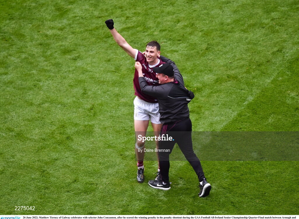 26 June 2022; Matthew Tierney of Galway celebrates with selector John Concannon, after he scored the winning penalty in the penalty shootout during the GAA Football All-Ireland Senior Championship Quarter-Final match between Armagh and Galway at Croke Park, Dublin. Photo by Daire Brennan/Sportsfile