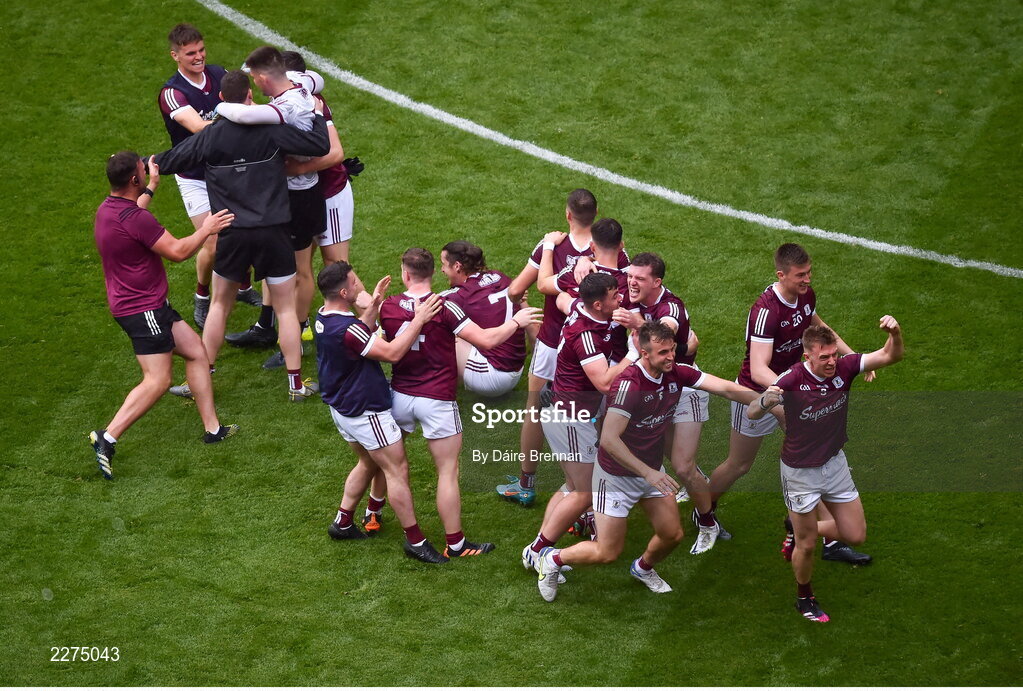 26 June 2022; Galway players run to celebrate with Matthew Tierney, 27, after he scored the winning penalty in the penalty shootout during the GAA Football All-Ireland Senior Championship Quarter-Final match between Armagh and Galway at Croke Park, Dublin. Photo by Daire Brennan/Sportsfile