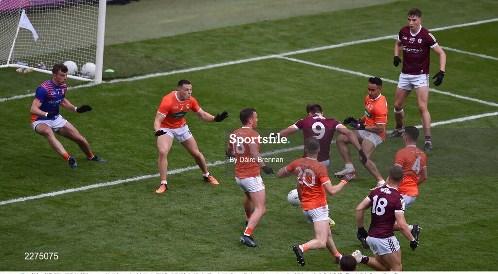 26 June 2022; Cillian McDaid of Galway scores his side's second goal during the GAA Football All-Ireland Senior Championship Quarter-Final match between Armagh and Galway at Croke Park, Dublin. Photo by Daire Brennan/Sportsfile