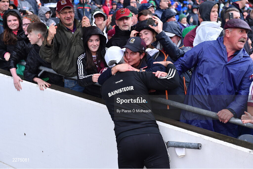 26 June 2022; Galway manager Padraic Joyce celebrates with his sister Carol after their side's victory in the penalty shoot-out of the GAA Football All-Ireland Senior Championship Quarter-Final match between Armagh and Galway at Croke Park, Dublin. Photo by Piaras Ó Mídheach/Sportsfile