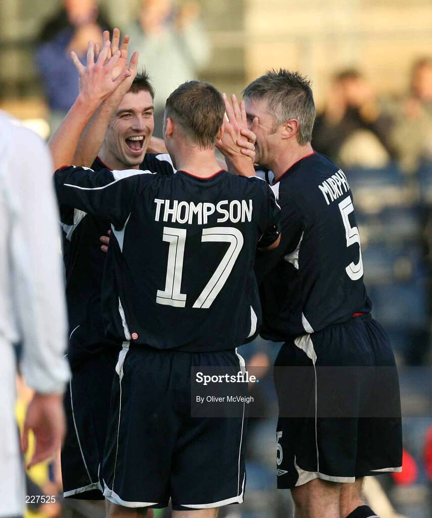 4 November 2006; Peter Thompson, Linfield celebrate with Steven Douglas and William Murphy after scoring the third goal. Carnegie Premier League, Lisburn Distillery v Linfield, Ballyskeagh, Lisburn, Co. Antrim. Picture credit: Oliver McVeigh / SPORTSFILE