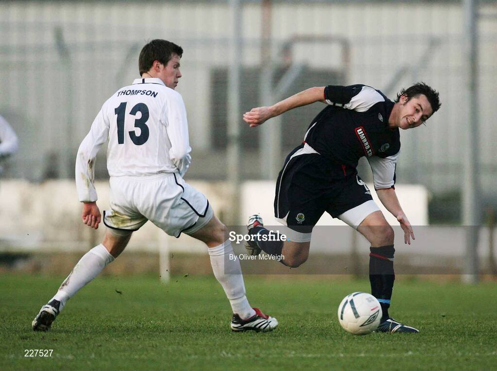 4 November 2006; Michael Gault, Linfield, in action against Stuart Thompson, Lisburn Distillery. Carnegie Premier League, Lisburn Distillery v Linfield, Ballyskeagh, Lisburn, Co. Antrim. Picture credit: Oliver McVeigh / SPORTSFILE