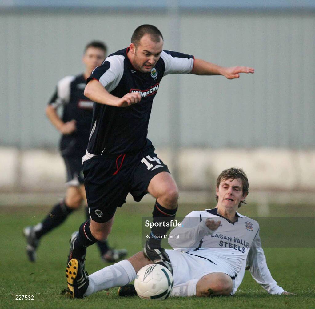 4 November 2006; Paul McAreavey, Linfield, in action against Aaron Johnston, Lisburn Distillery. Carnegie Premier League, Lisburn Distillery v Linfield, Ballyskeagh, Lisburn, Co. Antrim. Picture credit: Oliver McVeigh / SPORTSFILE