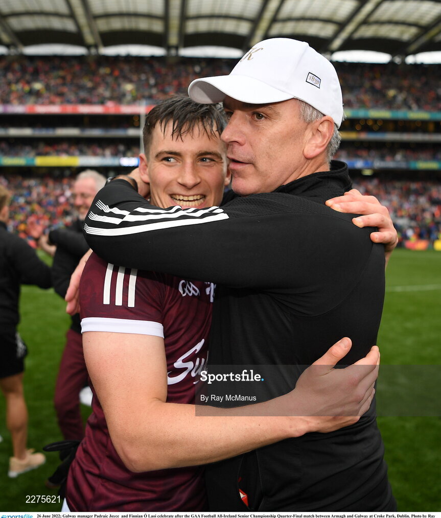26 June 2022; Galway manager Padraic Joyce and Finnian Ó Laoi celebrate after the GAA Football All-Ireland Senior Championship Quarter-Final match between Armagh and Galway at Croke Park, Dublin. Photo by Ray McManus/Sportsfile