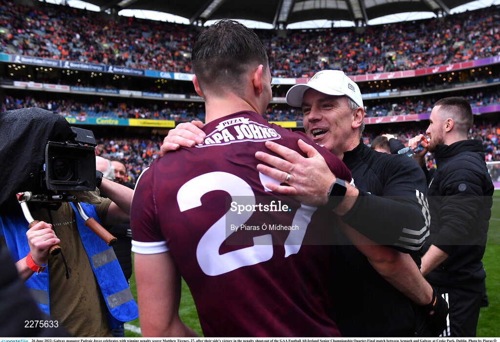 26 June 2022; Galway manager Padraic Joyce celebrates with winning penalty scorer Matthew Tierney, 27, after their side's victory in the penalty shoot-out of the GAA Football All-Ireland Senior Championship Quarter-Final match between Armagh and Galway at Croke Park, Dublin. Photo by Piaras Ó Mídheach/Sportsfile