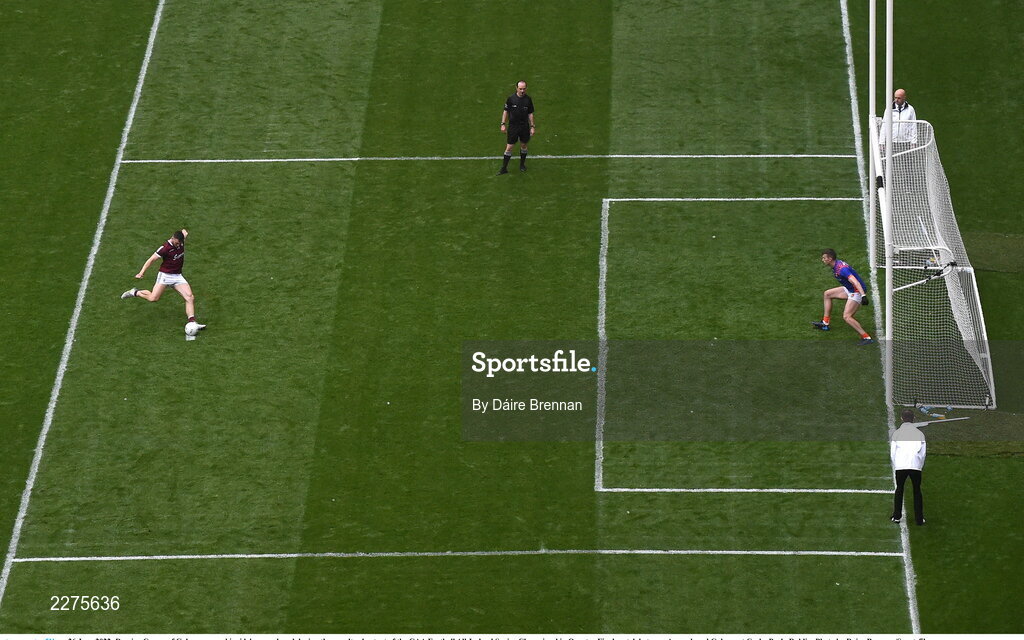 26 June 2022; Damien Comer of Galway scores his side's second goal during the penalty shootout of the GAA Football All-Ireland Senior Championship Quarter-Final match between Armagh and Galway at Croke Park, Dublin. Photo by Daire Brennan/Sportsfile