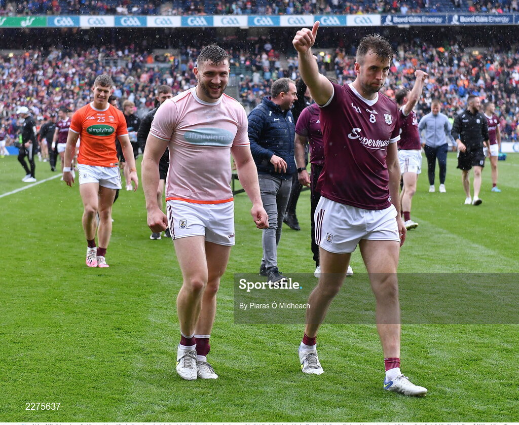 26 June 2022; Galway players Paul Conroy, right, and Damien Comer leave the pitch after their side's victory in the penalty shoot-out of the GAA Football All-Ireland Senior Championship Quarter-Final match between Armagh and Galway at Croke Park, Dublin. Photo by Piaras Ó Mídheach/Sportsfile
