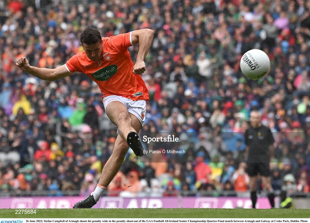 26 June 2022; Stefan Campbell of Armagh shoots his penalty wide in the penalty shoot-out of the GAA Football All-Ireland Senior Championship Quarter-Final match between Armagh and Galway at Croke Park, Dublin. Photo by Piaras Ó Mídheach/Sportsfile