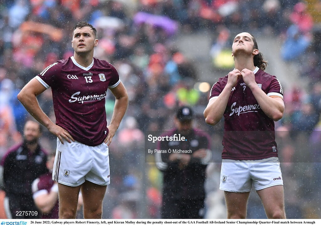 26 June 2022; Galway players Robert Finnerty, left, and Kieran Molloy during the penalty shoot-out of the GAA Football All-Ireland Senior Championship Quarter-Final match between Armagh and Galway at Croke Park, Dublin. Photo by Piaras Ó Mídheach/Sportsfile