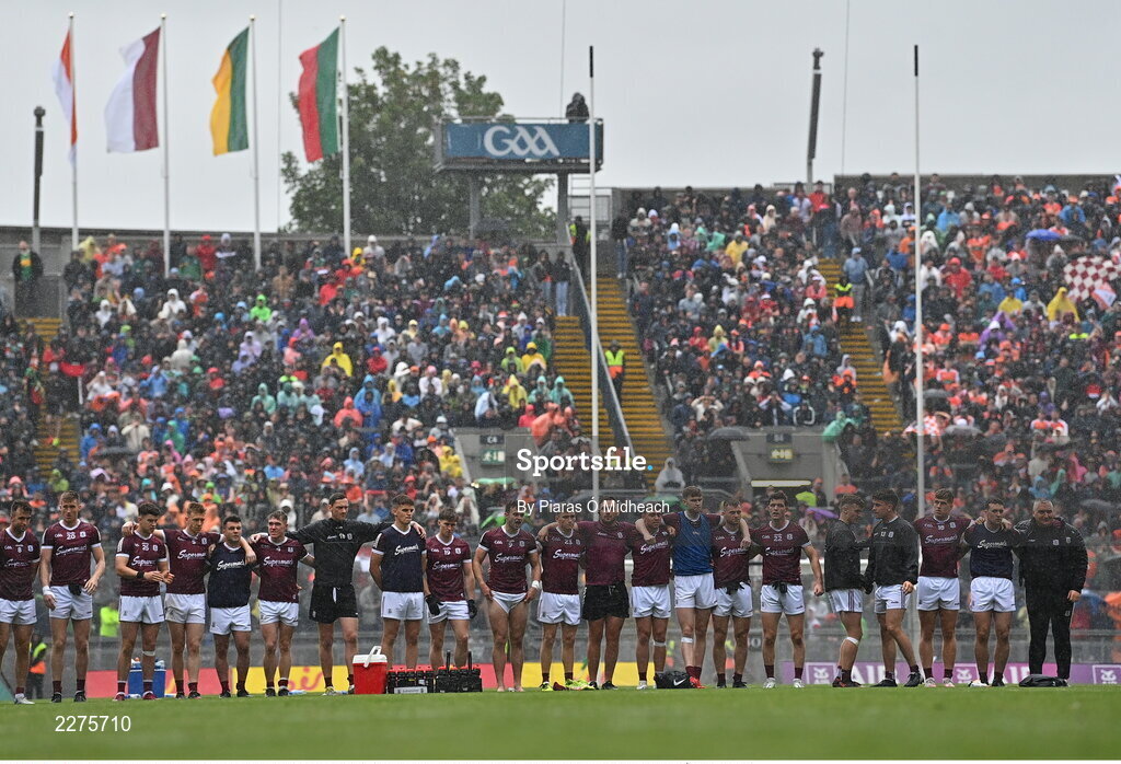 26 June 2022; Galway players during the penalty shoot-out of the GAA Football All-Ireland Senior Championship Quarter-Final match between Armagh and Galway at Croke Park, Dublin. Photo by Piaras Ó Mídheach/Sportsfile
