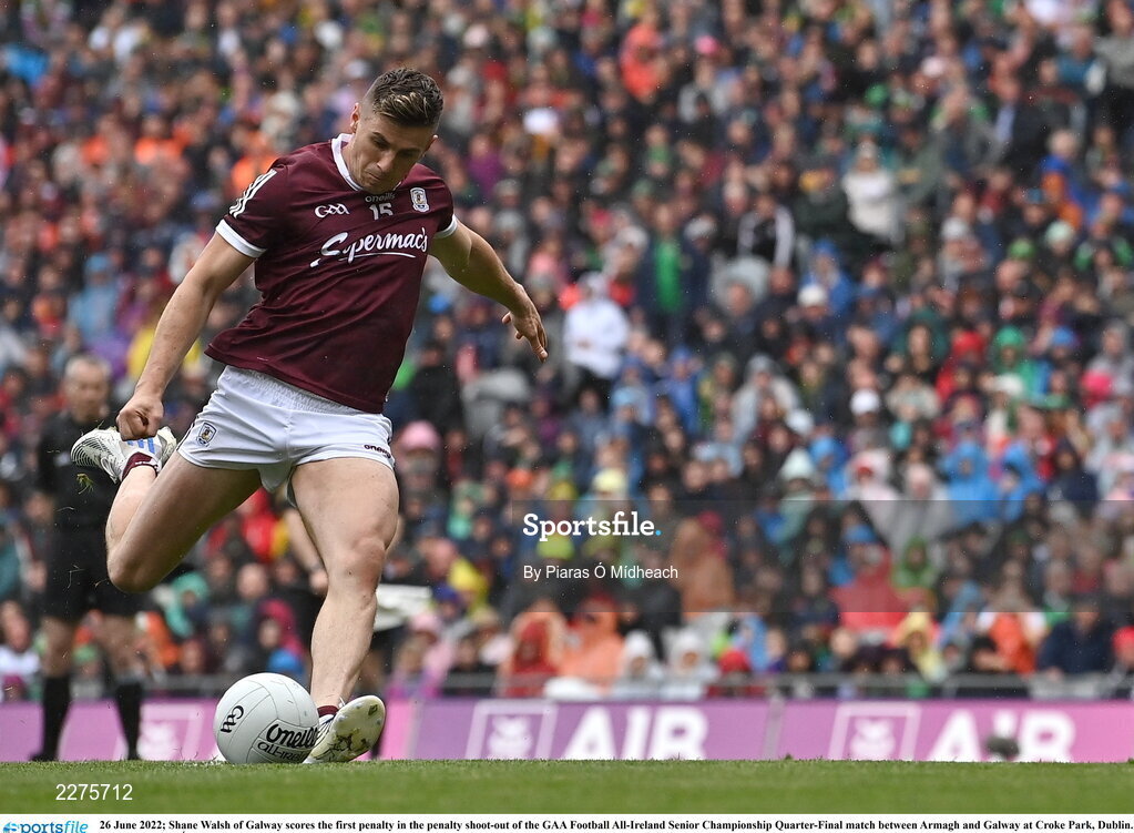 26 June 2022; Shane Walsh of Galway scores the first penalty in the penalty shoot-out of the GAA Football All-Ireland Senior Championship Quarter-Final match between Armagh and Galway at Croke Park, Dublin. Photo by Piaras Ó Mídheach/Sportsfile