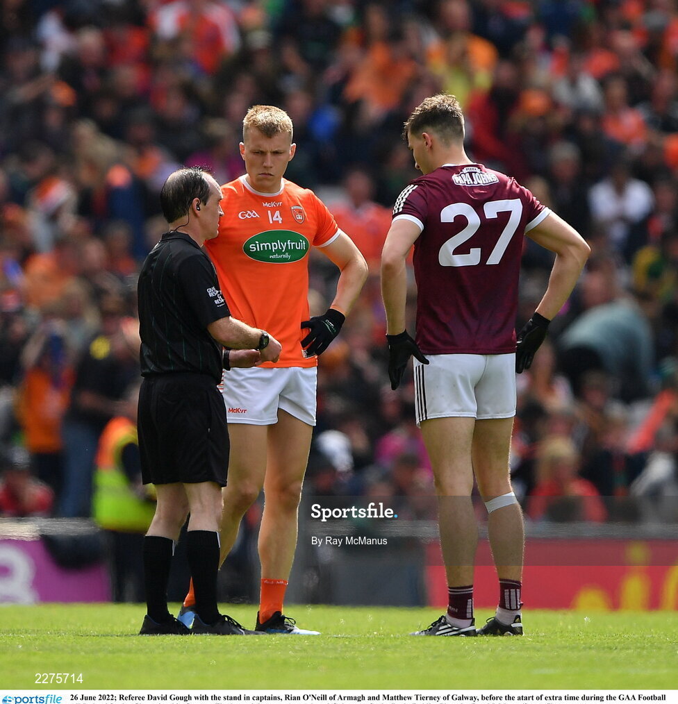 26 June 2022; Referee David Gough with the stand in captains, Rian O'Neill of Armagh and Matthew Tierney of Galway, before the atart of extra time during the GAA Football All-Ireland Senior Championship Quarter-Final match between Armagh and Galway at Croke Park, Dublin. Photo by Ray McManus/Sportsfile