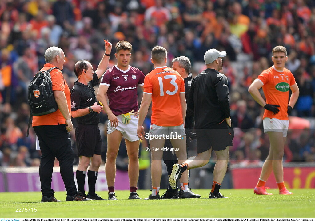 26 June 2022; The two captains, Seán Kelly of Galway and Aidan Nugent of Armagh, are issued with red cards before the start of extra time after a melee as the teams went to the dressing rooms at full time at the GAA Football All-Ireland Senior Championship Quarter-Final match between Armagh and Galway at Croke Park, Dublin. Photo by Ray McManus/Sportsfile