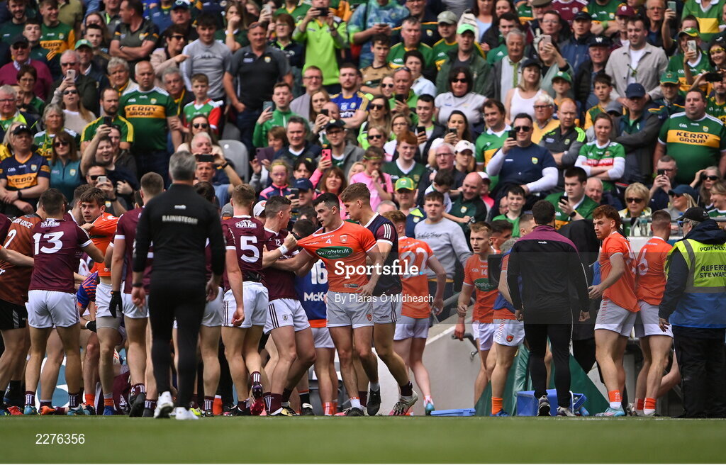 26 June 2022; Players and officials from both sides become embroiled as they make their way to the dressing rooms after full time ended in a draw at the GAA Football All-Ireland Senior Championship Quarter-Final match between Armagh and Galway at Croke Park, Dublin. Photo by Piaras Ó Mídheach/Sportsfile