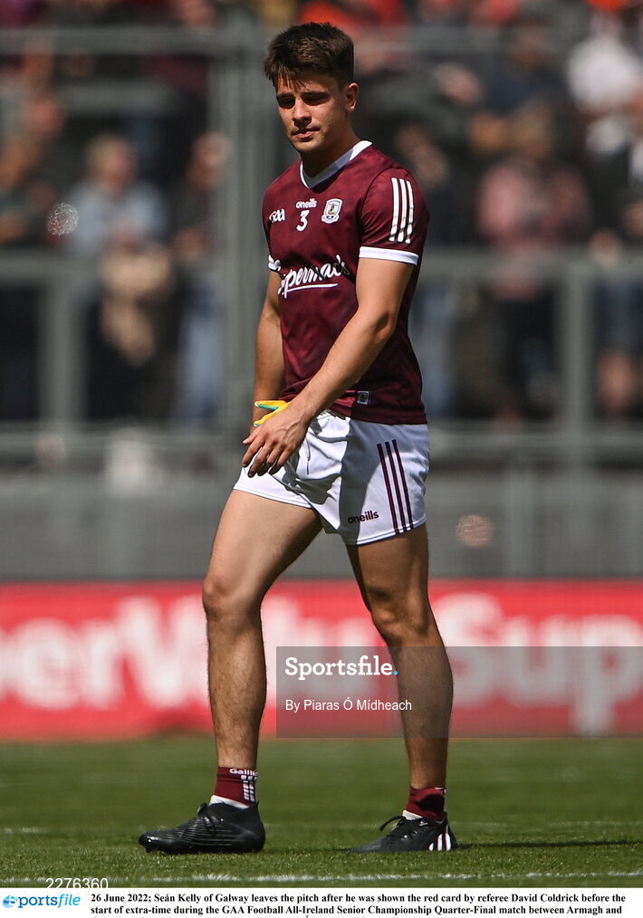 26 June 2022; Seán Kelly of Galway leaves the pitch after he was shown the red card by referee David Coldrick before the start of extra-time during the GAA Football All-Ireland Senior Championship Quarter-Final match between Armagh and Galway at Croke Park, Dublin. Photo by Piaras Ó Mídheach/Sportsfile