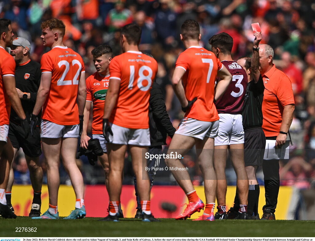26 June 2022; Referee David Coldrick shows the red card to Aidan Nugent of Armagh, 3, and Seán Kelly of Galway, 3, before the start of extra-time during the GAA Football All-Ireland Senior Championship Quarter-Final match between Armagh and Galway at Croke Park, Dublin. Photo by Piaras Ó Mídheach/Sportsfile
