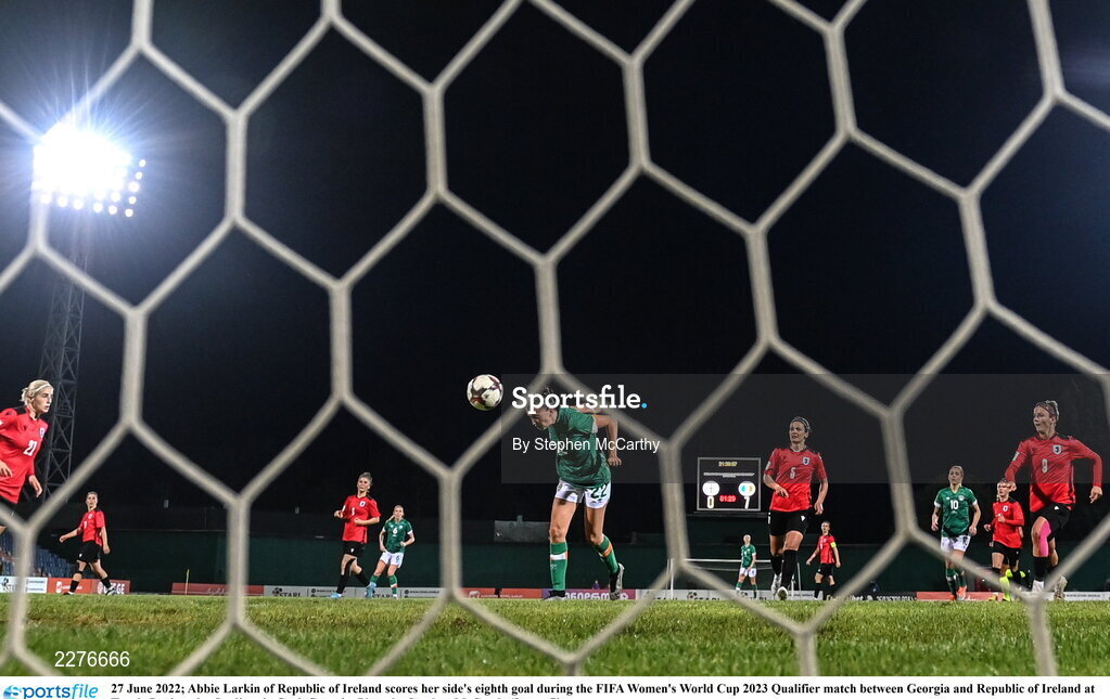 27 June 2022; Abbie Larkin of Republic of Ireland scores her side's eighth goal during the FIFA Women's World Cup 2023 Qualifier match between Georgia and Republic of Ireland at Tengiz Burjanadze Stadium in Gori, Georgia. Photo by Stephen McCarthy/Sportsfile