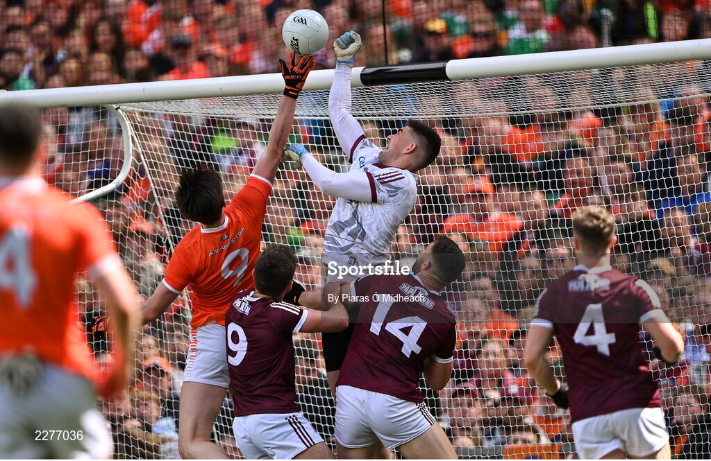26 June 2022; Galway goalkeeper Conor Gleeson in action against Ben Crealey of Armagh during the GAA Football All-Ireland Senior Championship Quarter-Final match between Armagh and Galway at Croke Park, Dublin. Photo by Piaras Ó Mídheach/Sportsfile