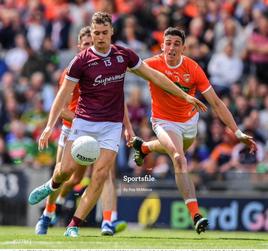 26 June 2022; Robert Finnerty of Galway in action against Rory Grugan of Armagh during the GAA Football All-Ireland Senior Championship Quarter-Final match between Armagh and Galway at Croke Park, Dublin. Photo by Ray McManus/Sportsfile