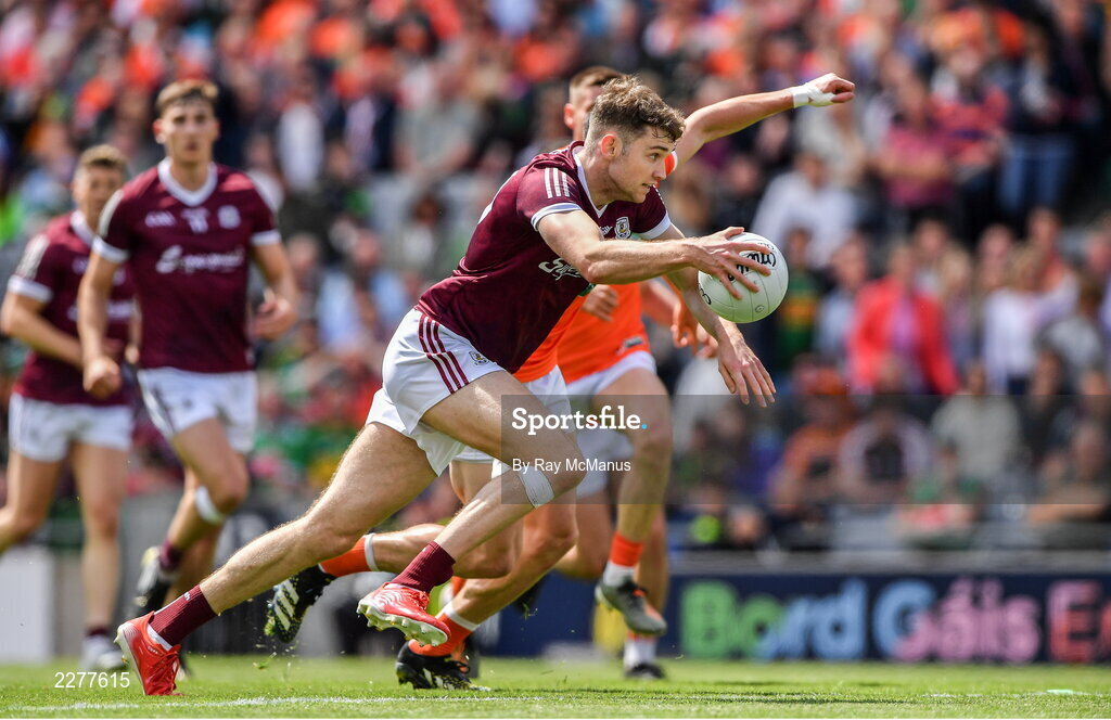 26 June 2022; Patrick Kelly of Galway in action against Rory Grugan of Armagh during the GAA Football All-Ireland Senior Championship Quarter-Final match between Armagh and Galway at Croke Park, Dublin. Photo by Ray McManus/Sportsfile