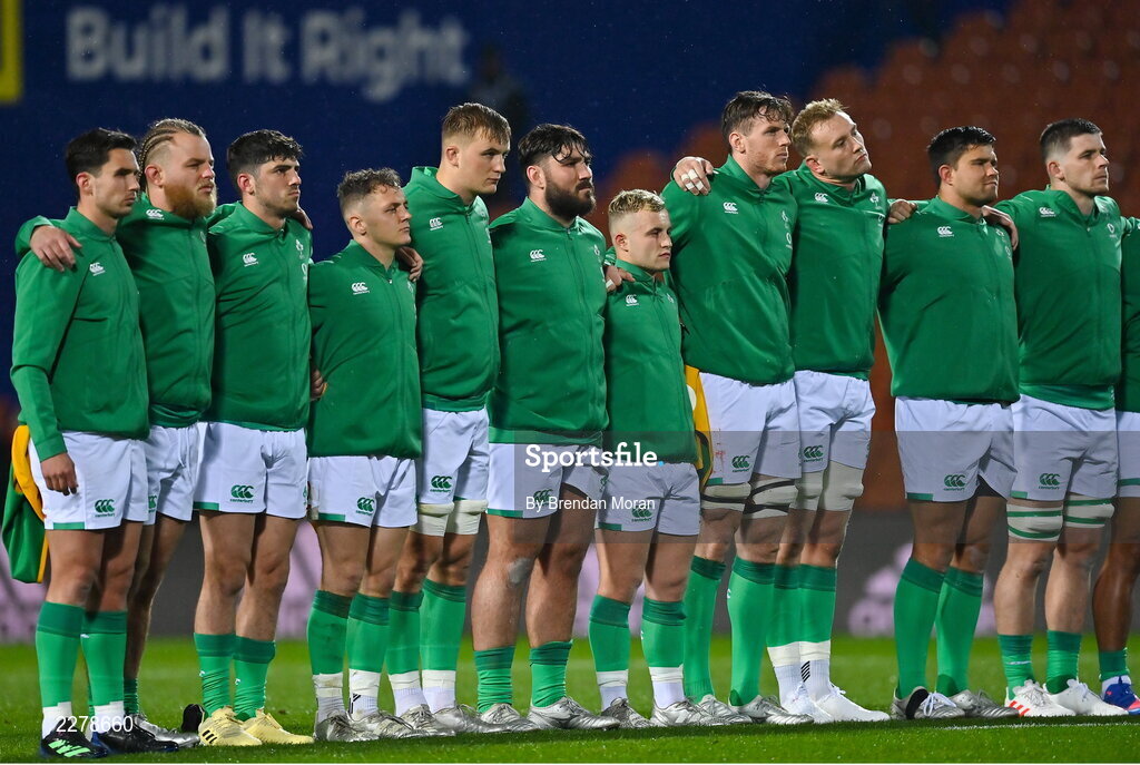 29 June 2022; Ireland players line up to face the haka before the match between the Maori All Blacks and Ireland at the FMG Stadium in Hamilton, New Zealand. Photo by Brendan Moran/Sportsfile