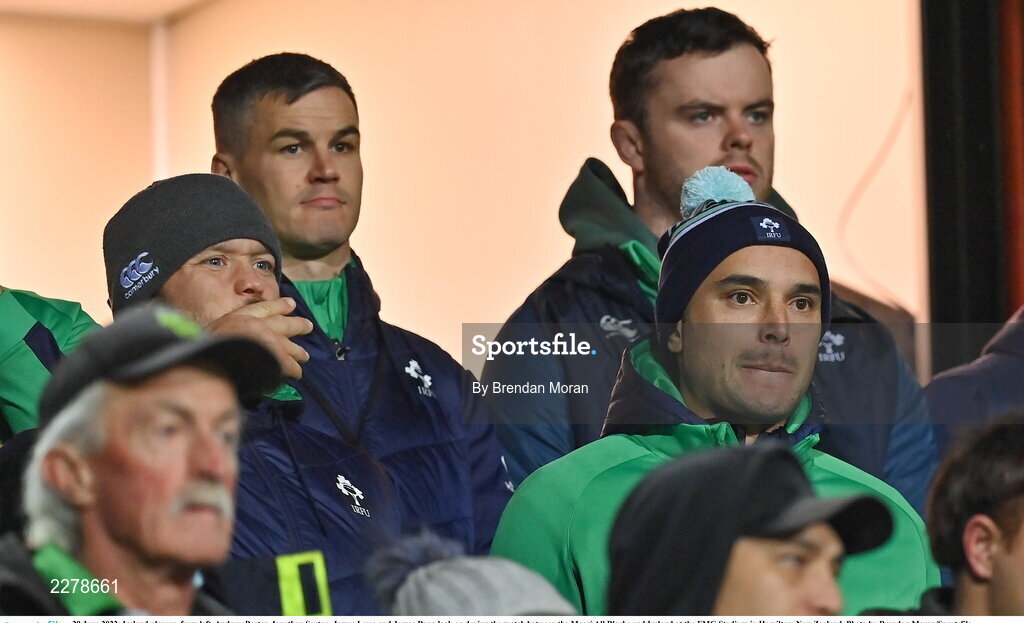 29 June 2022; Ireland players, from left, Andrew Porter, Jonathan Sexton, James Lowe and James Ryan look on during the match between the Maori All Blacks and Ireland at the FMG Stadium in Hamilton, New Zealand. Photo by Brendan Moran/Sportsfile