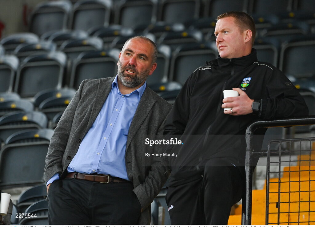 1 July 2022; Suspended UCD manager Andy Myler and coach William O'Connor look on from the stand before the SSE Airtricity League Premier Division match between Dundalk and UCD at Oriel Park in Dundalk, Louth. Photo by Harry Murphy/Sportsfile