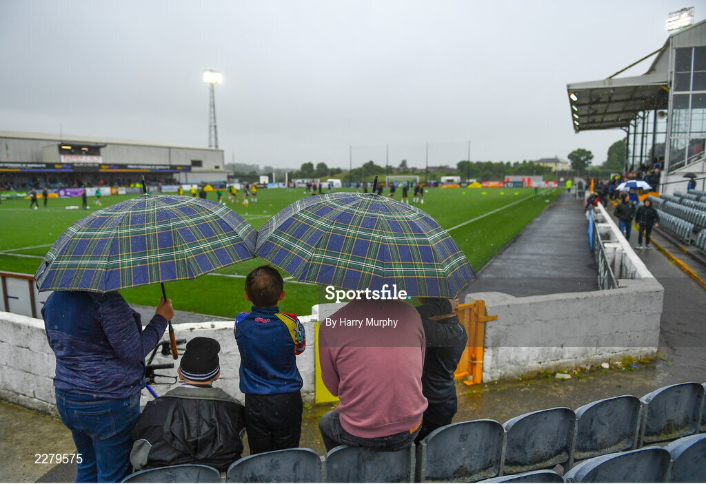 1 July 2022; Dundalk supporters watch the warm-up in the rain before the SSE Airtricity League Premier Division match between Dundalk and UCD at Oriel Park in Dundalk, Louth. Photo by Harry Murphy/Sportsfile
