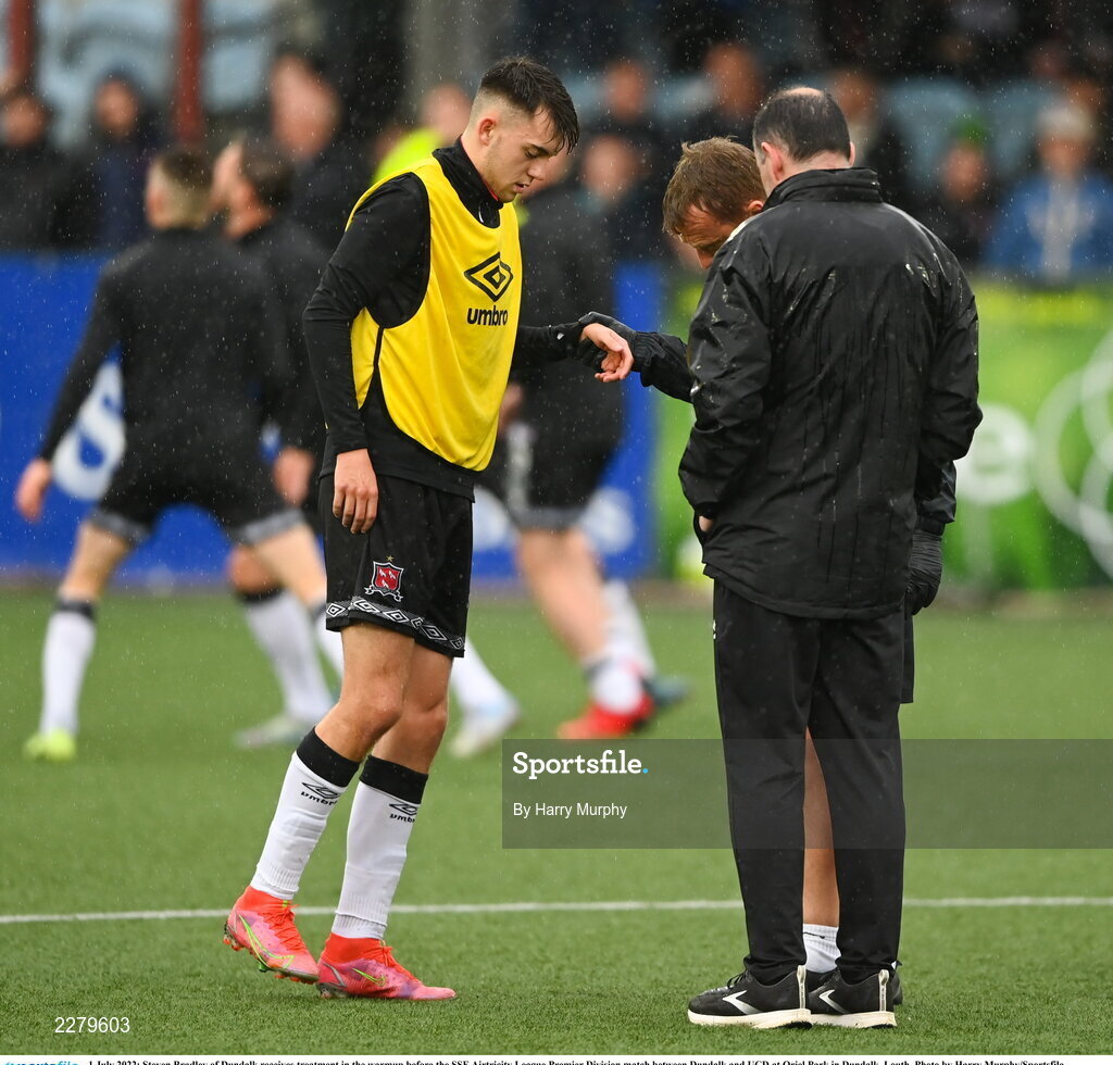 1 July 2022; Steven Bradley of Dundalk receives treatment in the warmup before the SSE Airtricity League Premier Division match between Dundalk and UCD at Oriel Park in Dundalk, Louth. Photo by Harry Murphy/Sportsfile