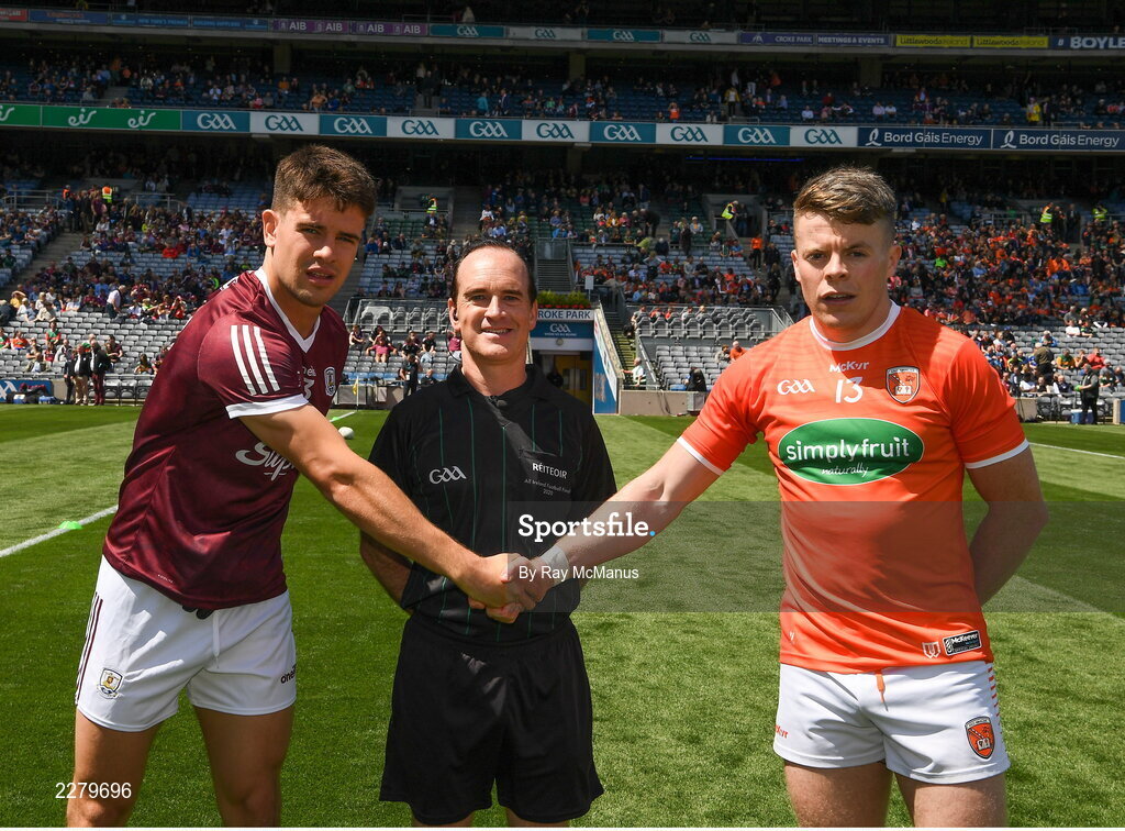 26 June 2022; Referee David Coldrick with the Galway captain, Seán Kelly, left, and the Armagh captain, Aidan Nugent, before the GAA Football All-Ireland Senior Championship Quarter-Final match between Armagh and Galway at Croke Park, Dublin. Photo by Ray McManus/Sportsfile