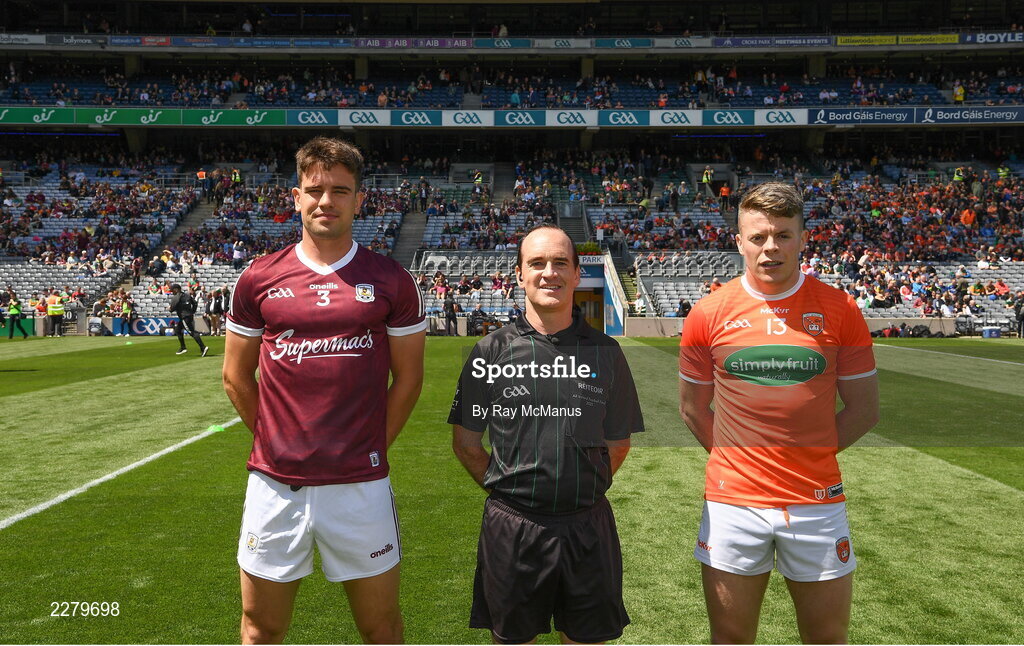 26 June 2022; Referee David Coldrick with the Galway captain, Seán Kelly, left, and the Armagh captain, Aidan Nugent, before the GAA Football All-Ireland Senior Championship Quarter-Final match between Armagh and Galway at Croke Park, Dublin. Photo by Ray McManus/Sportsfile