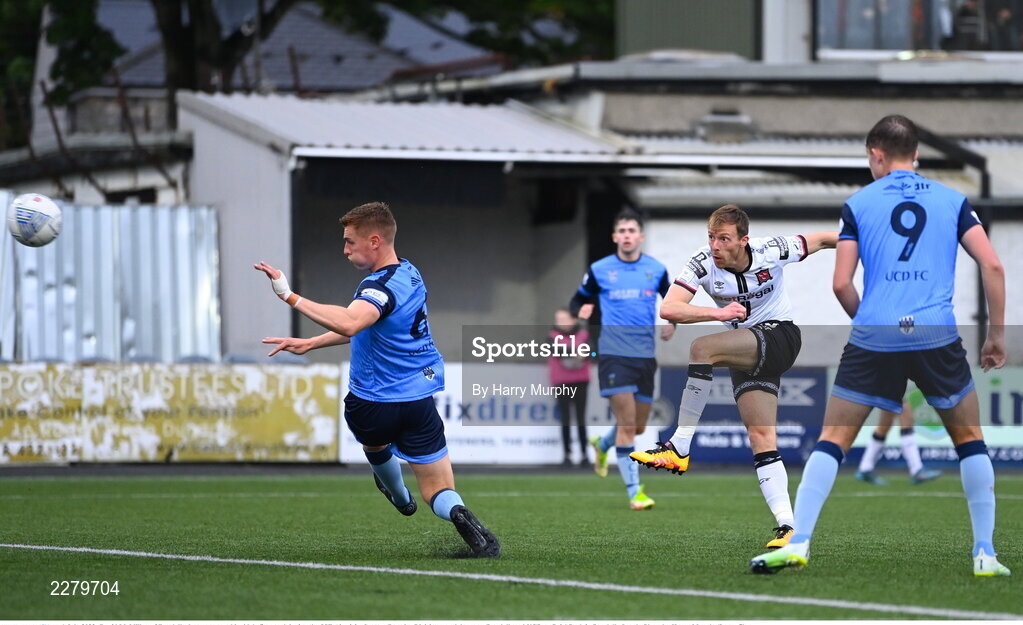 1 July 2022; David McMillan of Dundalk shoots to score his side's first goal during the SSE Airtricity League Premier Division match between Dundalk and UCD at Oriel Park in Dundalk, Louth. Photo by Harry Murphy/Sportsfile