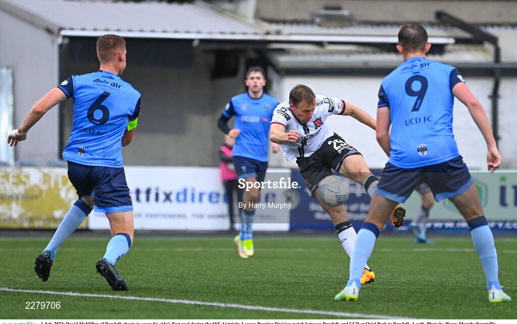 1 July 2022; David McMillan of Dundalk shoots to score his side's first goal during the SSE Airtricity League Premier Division match between Dundalk and UCD at Oriel Park in Dundalk, Louth. Photo by Harry Murphy/Sportsfile