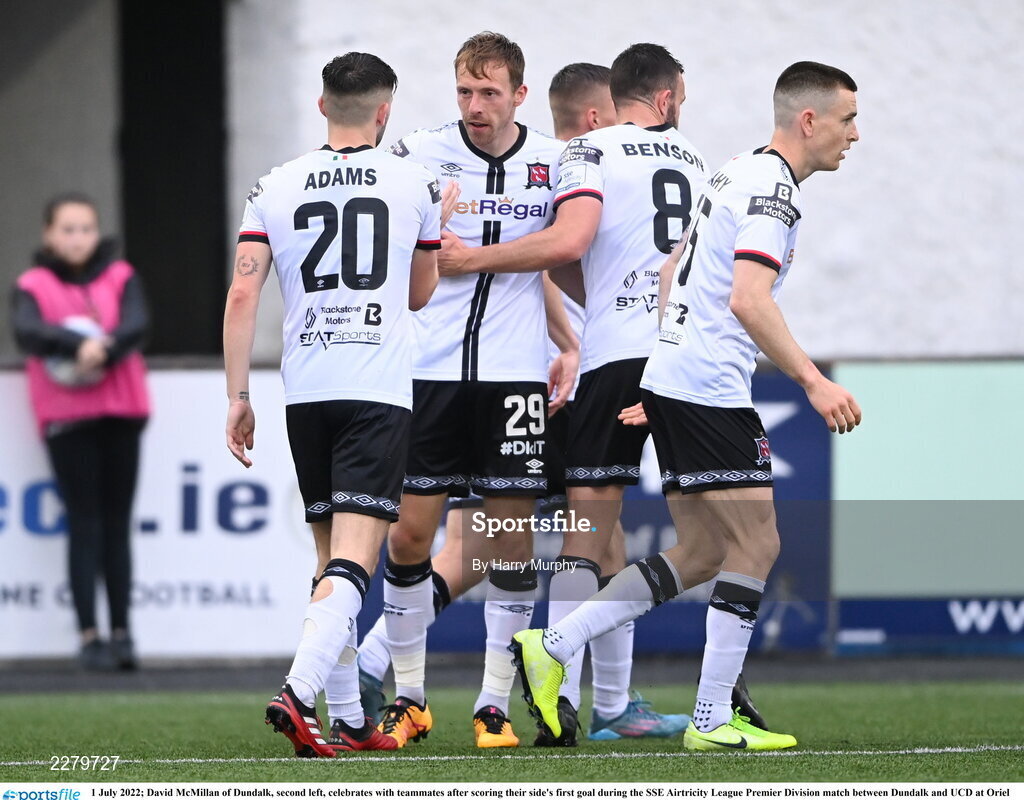 1 July 2022; David McMillan of Dundalk, second left, celebrates with teammates after scoring their side's first goal during the SSE Airtricity League Premier Division match between Dundalk and UCD at Oriel Park in Dundalk, Louth. Photo by Harry Murphy/Sportsfile