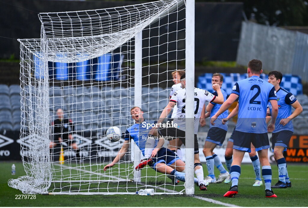 1 July 2022; Joe Adams of Dundalk ensures the ball crosses the line as Greg Sloggett of Dundalk scores his side's second goal during the SSE Airtricity League Premier Division match between Dundalk and UCD at Oriel Park in Dundalk, Louth. Photo by Harry Murphy/Sportsfile