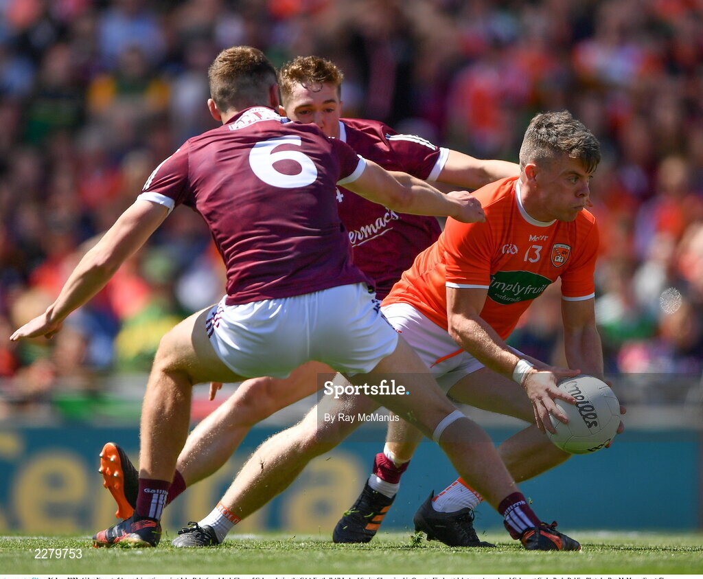 26 June 2022; Aidan Nugent of Armagh in action against John Daly, 6, and Jack Glynn of Galway during the GAA Football All-Ireland Senior Championship Quarter-Final match between Armagh and Galway at Croke Park, Dublin. Photo by Ray McManus/Sportsfile