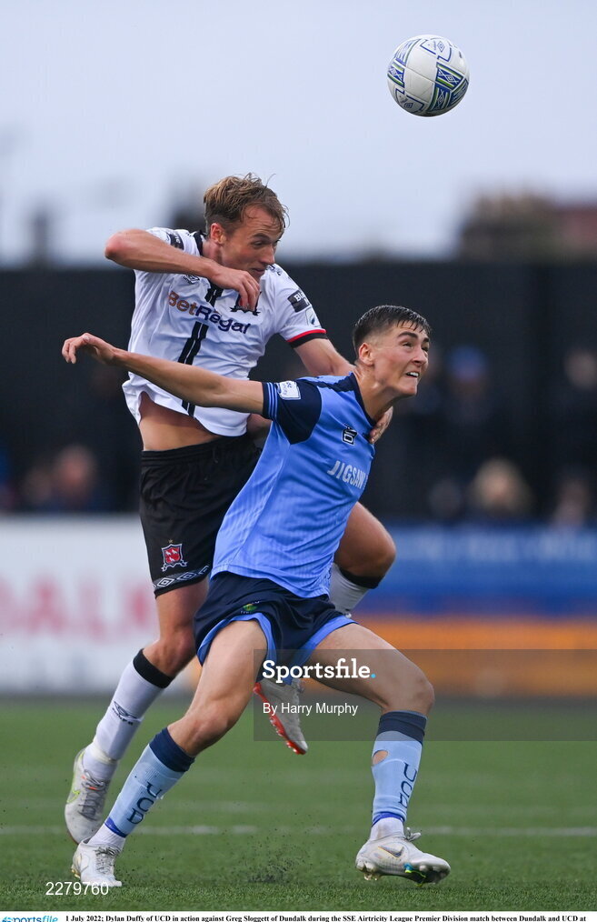 1 July 2022; Dylan Duffy of UCD in action against Greg Sloggett of Dundalk during the SSE Airtricity League Premier Division match between Dundalk and UCD at Oriel Park in Dundalk, Louth. Photo by Harry Murphy/Sportsfile