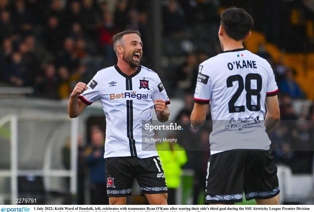 1 July 2022; Keith Ward of Dundalk, left, celebrates with teammates Ryan O'Kane after scoring their side's third goal during the SSE Airtricity League Premier Division match between Dundalk and UCD at Oriel Park in Dundalk, Louth. Photo by Harry Murphy/Sportsfile