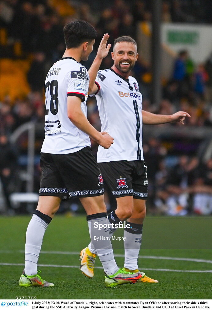 1 July 2022; Keith Ward of Dundalk, right, celebrates with teammates Ryan O'Kane after scoring their side's third goal during the SSE Airtricity League Premier Division match between Dundalk and UCD at Oriel Park in Dundalk, Louth. Photo by Harry Murphy/Sportsfile