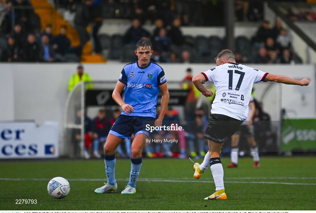 1 July 2022; Keith Ward of Dundalk shoots to score his side's third goal during the SSE Airtricity League Premier Division match between Dundalk and UCD at Oriel Park in Dundalk, Louth. Photo by Harry Murphy/Sportsfile