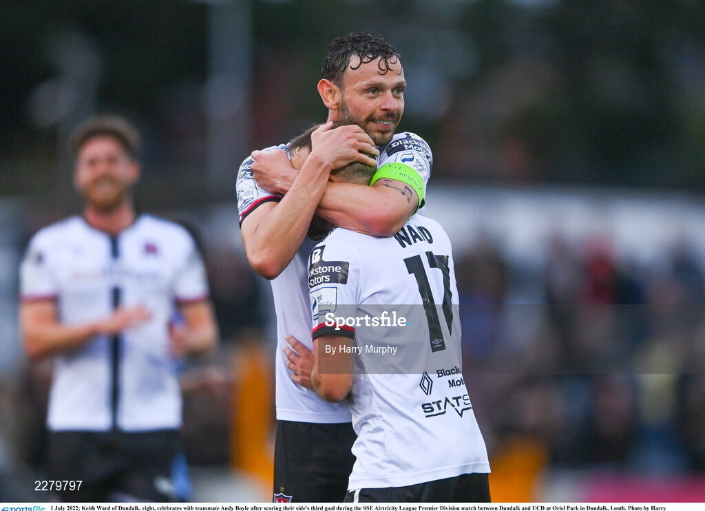 1 July 2022; Keith Ward of Dundalk, right, celebrates with teammate Andy Boyle after scoring their side's third goal during the SSE Airtricity League Premier Division match between Dundalk and UCD at Oriel Park in Dundalk, Louth. Photo by Harry Murphy/Sportsfile