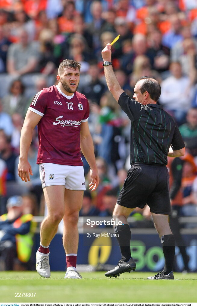 26 June 2022; Damien Comer of Galway is shown a yellow card by referee David Coldrick during the GAA Football All-Ireland Senior Championship Quarter-Final match between Armagh and Galway at Croke Park, Dublin. Photo by Ray McManus/Sportsfile