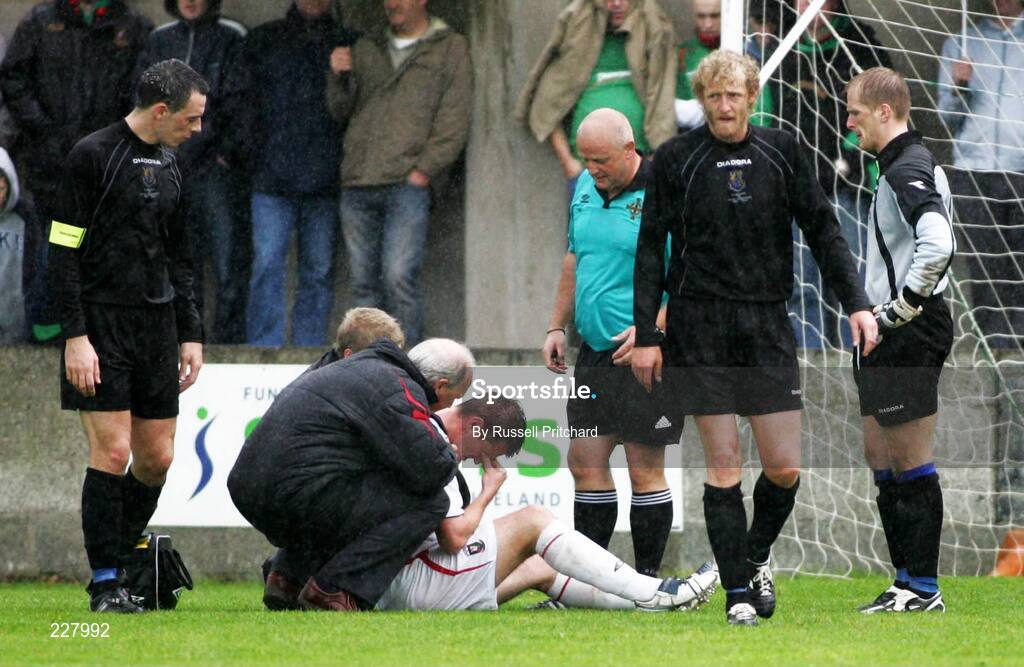 23 September 2006; Johnny Cowan, Armagh City, looks on as Colin Nixon, Glentoran, receives treatment from Glentoran's Dr Kyle. Carnegie Premier League, Armagh City v Glentoran, Holm Park, Armagh, Co. Armagh. Picture credit: Russell Pritchard / SPORTSFILE