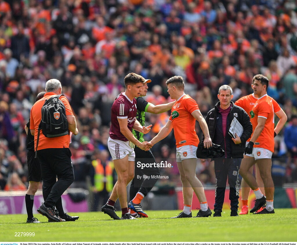 26 June 2022;The two captains, Seán Kelly of Galway and Aidan Nugent of Armagh, centre, shake hands after they both had been issued with red cards before the start of extra time after a melee as the teams went to the dressing rooms at full time at the GAA Football All-Ireland Senior Championship Quarter-Final match between Armagh and Galway at Croke Park, Dublin. Photo by Ray McManus/Sportsfile