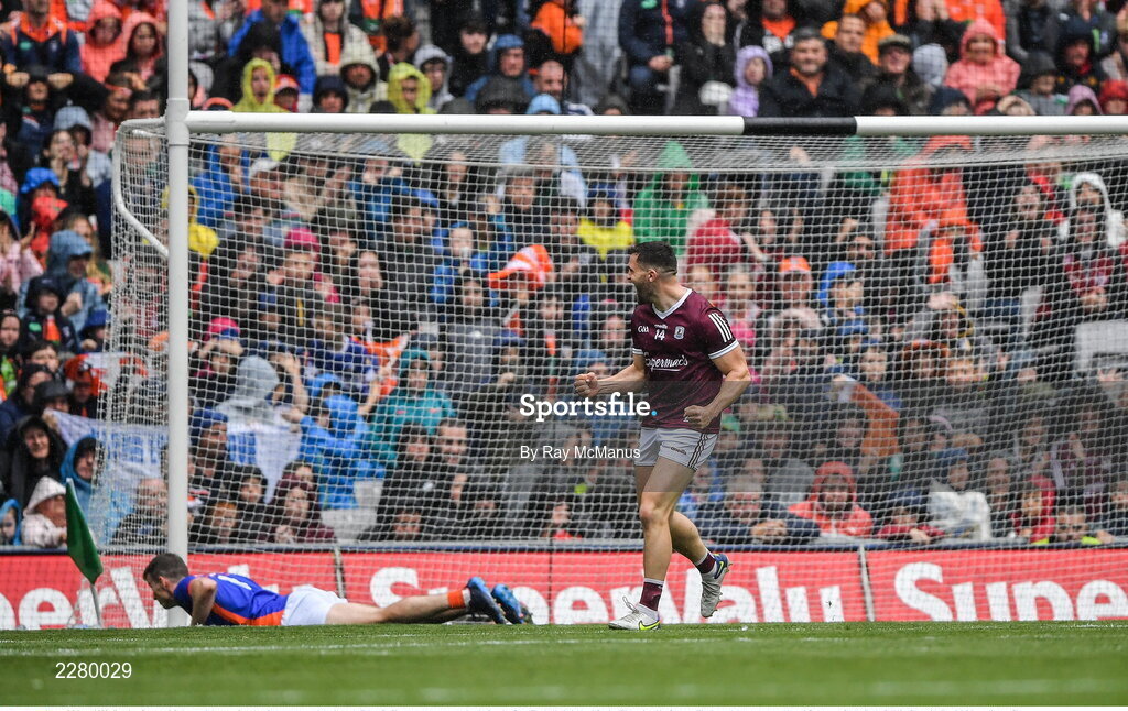 26 June 2022; Damien Comer of Galway celebrates aftre shooting past Armagh goalkeeper Ethan Rafferty to convert a penalty during the GAA Football All-Ireland Senior Championship Quarter-Final match between Armagh and Galway at Croke Park, Dublin. Photo by Ray McManus/Sportsfile