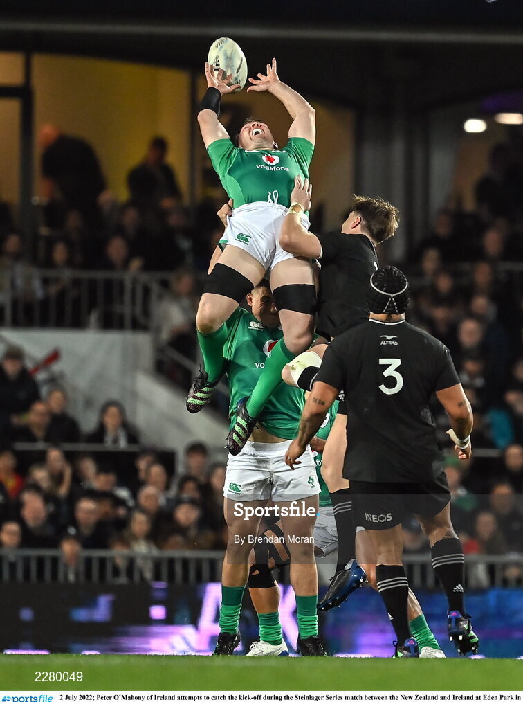 2 July 2022; Peter O’Mahony of Ireland attempts to catch the kick-off during the Steinlager Series match between the New Zealand and Ireland at Eden Park in Auckland, New Zealand. Photo by Brendan Moran/Sportsfile