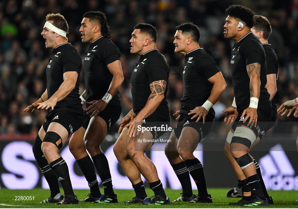 2 July 2022; New Zealand captain Sam Cane leads the Haka before the Steinlager Series match between the New Zealand and Ireland at Eden Park in Auckland, New Zealand. Photo by Brendan Moran/Sportsfile