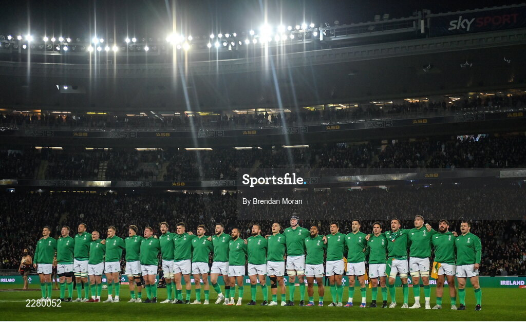 2 July 2022; Ireland players stand for Ireland's Call before the Steinlager Series match between the New Zealand and Ireland at Eden Park in Auckland, New Zealand. Photo by Brendan Moran/Sportsfile